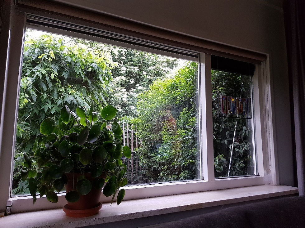 De afgelopen dagen hebben we een paar fijne buien gehad. Het groen spuit nu de grond uit. Als we uit het zijraam van de woonkamer kijken, zien we dit. We wonen nu officieel in een jungle. Tijd voor een beetje snoeiwerk.